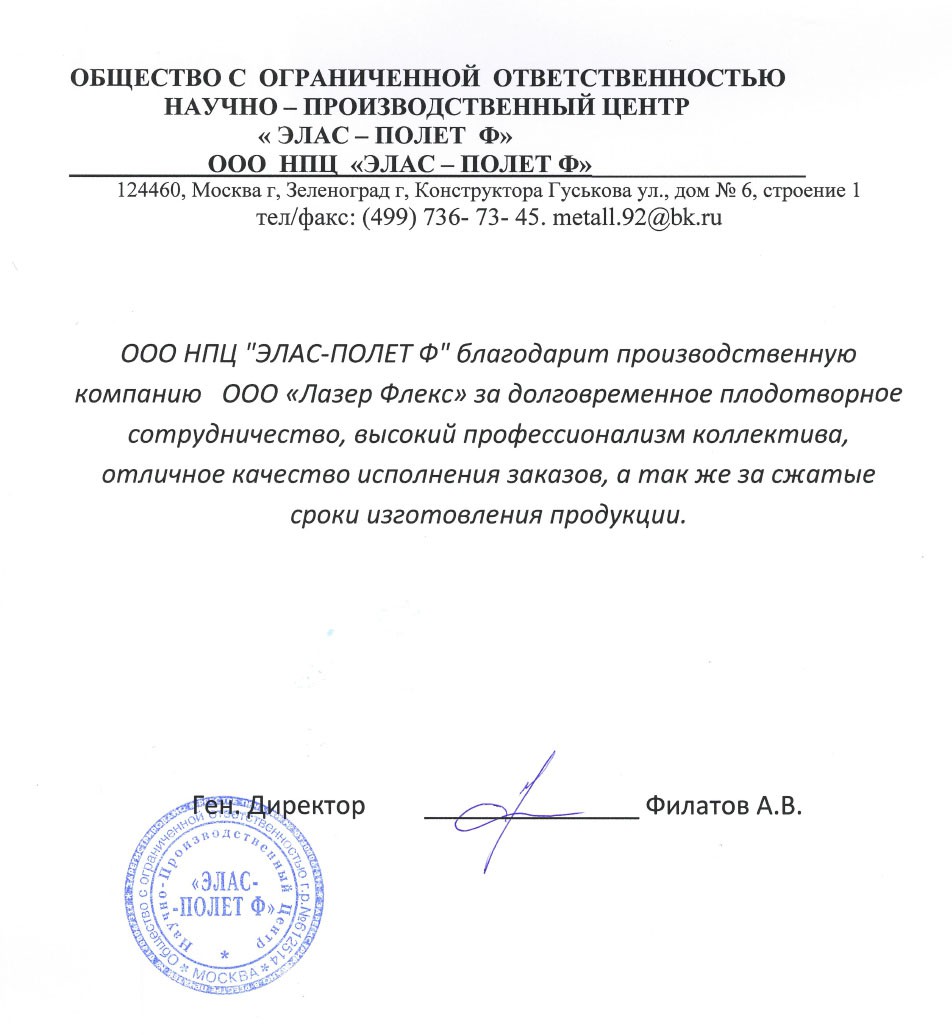 Опыт совместной работы позволяет говорить о производственной компании ООО «Лазер Флекс » как о надежном, безусловно исполняющем взятые на себя обязательства партнере. Профессиональный подход к работе специалистов ООО «Лазер Флекс » заслуживает высоких оценок. Желаем ООО «Лазер Флекс » процветания и рекомендуем ее в качестве надежного долгосрочного партнера.